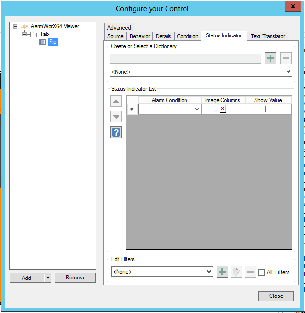 There are predefined sets of status indicators that you can use for your alarms. You can also create your own sets. Each set is called a dictionary. In the Status Indicator tab, you assign an icon to each filter (filters are defined in the Conditions tab, so make sure you filters are defined first). You also set each filter's Show Value check box which, when selected, in runtime shows the original value of the cell together with the icon.