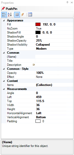 The pushpin's Properties tab shows several properties for the object, which you can change as required.