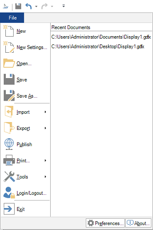 Note the blue File button to the far left on the GraphWorX64 ribbon. Clicking the File button opens the GraphWorX File menu which provides additional functions and access to GraphWorX features. From this menu you can: