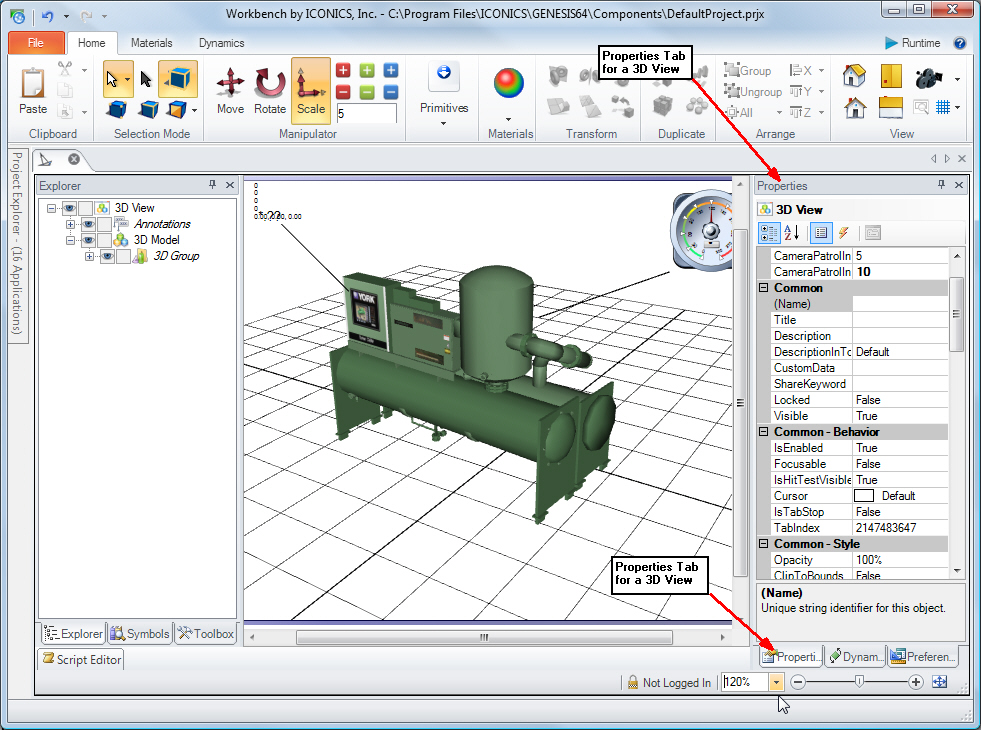 Note: You can access an object's properties on the GraphWorX64 Properties tab. If the Properties tab does not appear, go to the 2D space, and from the View tab’s Show/Hide section, make sure the Properties check box is selected.