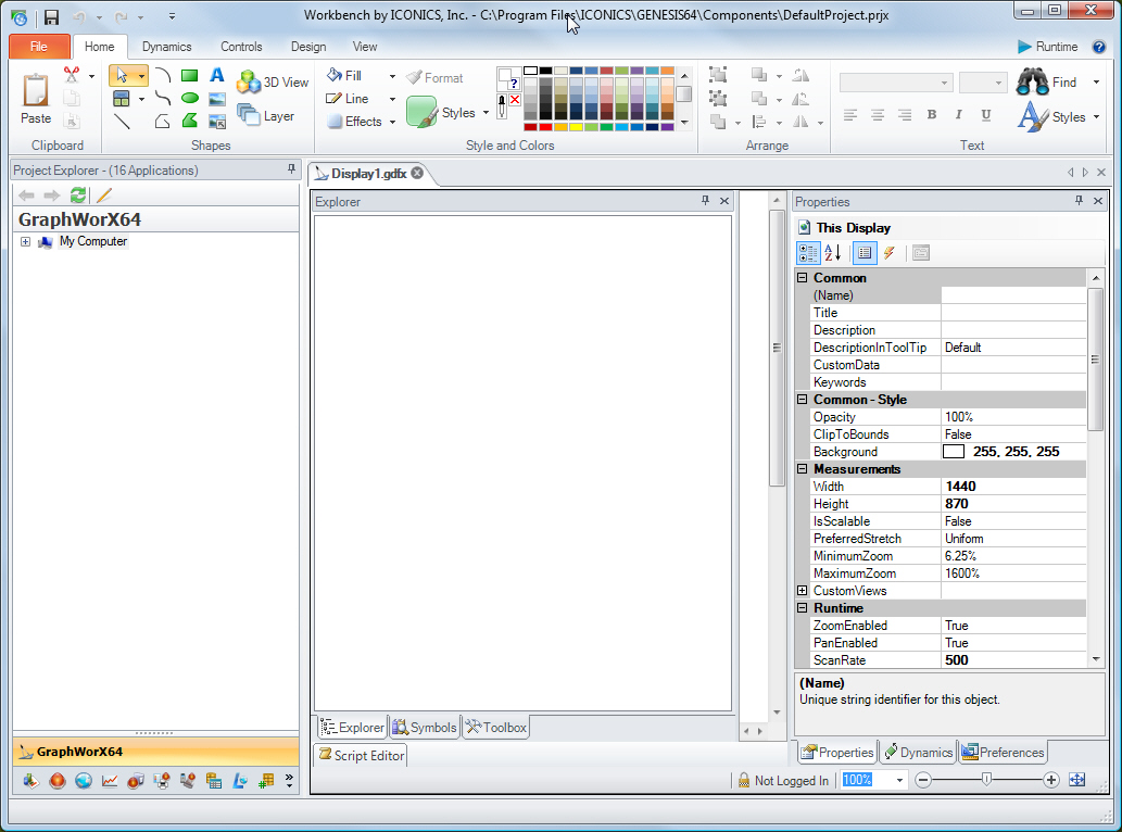 Once in GraphworX64, you can use the File menu to open an existing display, add shapes, access the 3D viewport, add examples and text, and work in GraphWorX64. There are five 2D ribbons: Home, Dynamics, Controls, Design and View. (When working in a 3D view, there are four 3D ribbons, which you can read more about in 3D Viewport Ribbons.)