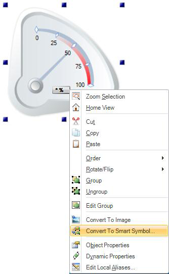 A typical example of a Smart Symbol is the gauge. When such a symbol is pasted into a GraphWorX64 display, it is often necessary to change the data source that drives the rotation animation bound to the needle. One could also change the color of the needle or the ranges. These changes in a normal object group require you to drill into the group using the Edit Group function or ungroup the symbol to modify the properties one by one.