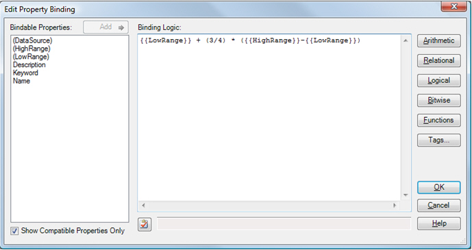 Example. The following example shows you how to bind the low and high ranges as smart properties and how to dynamically calculate the rest of the labels on the scale.