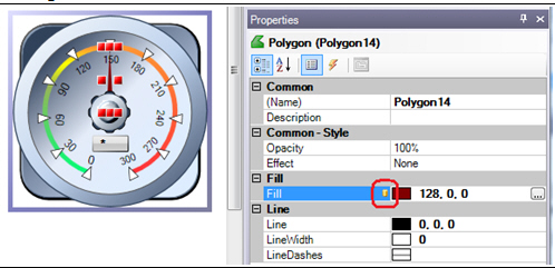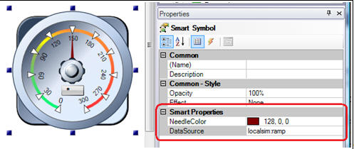 If such a group is converted into the Smart Symbol, properties like the data source, needle color, and ranges can be exposed as Smart Properties and configured in the Properties tab.