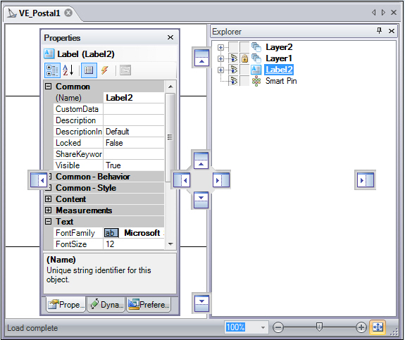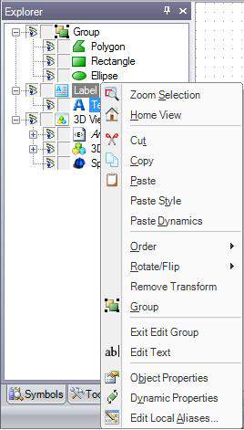 The objects shown in the object Explorer are synchronized with the objects that you see in the design window. As you select an object in either location the selection changes in the second location. Right-clicking an object on the drawing surface or in the Explorer pops up a menu of actions you can take on that object; if an object in the display is difficult to click on (for example, because it covered by other objects or hidden), right-clicking it in the Explorer gives you easy access to those options.