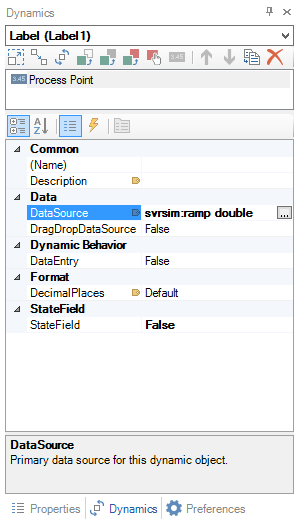 Dynamics. The Dynamics tab of the Properties pane shows the different actions and events that are defined for an object; properties on this tab are called dynamic properties. Not all objects have dynamics associated with them, but those that do appear as underlined text in the Object Explorer. You can associate a dynamic with an object by selecting that object and clicking on the various actions in the Buttons, Dimensions, Colors, Selectors, and Smart Symbols tab groups in the GraphWorX64 Dynamics ribbon. You can also use the buttons for the different actions underneath the object drop down menu in the Dynamics tab. You can view this tab by enabling the Dynamics check box in the Show/Hide section of the View ribbon in 2D GraphWorX64, or you can right-click an object in the display then, from the pop-up menu, click Dynamic Properties. Objects' dynamic properties are described throughout the help system; you can use the Search feature to find them.