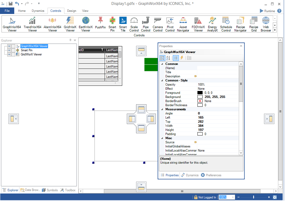selecting the value or expression from the Unified Data Browser. You can view this tab by putting a check mark next to Properties in the Show/Hide section of the View ribbon in 2D GraphWorX64, or you can right-click an object in the display then, from the pop-up menu, click Object Properties. Objects' properties are described throughout the help system; you can use the Search feature to find them. The most common properties, though, are described below, in Common Properties.