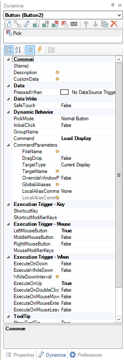 2. With the button selected, go to the Dynamics tab. If you look at the top of the Dynamics tab you can see that the button already has its own Pick dynamic which is automatically included in the button object when you add it. Note that its PickMode property is already set to the type of button you are creating; do not change it.