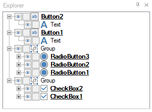 7. In a radio button group, only one button in the group can be selected (on) at a time; whereas in a checkbox button group, any number of its members can be selected. In order to enforce the rules for radio button behavior, for each radio button in the group, go to its GroupName property on the Dynamics tab and enter its group name. For example, if the radio buttons let runtime users select a region, the group name you assign to the radio buttons might be SelectRegion. Make sure the name is not used by any other radio button group in the display; this field is case sensitive, so make sure you use the same capitalization for each radio button in the group.