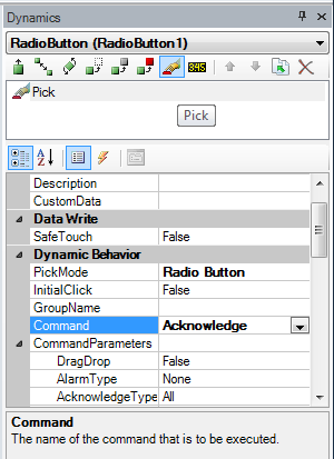 Note: You can acknowledge alarms here as well; just look under "Dynamic Behavior" to "Command" and select the pick action "Acknowledge" from the drop down list under Global Commands. (Must be in the AlarmWorX64 Viewer).