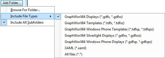 Click Add Files to open a window where you can navigate to and select GraphWorX64 Display (.gdfx or .gdfxz) files, Windows Phone display files (.gdfxp or .gdfxpz), GraphWorX64 Template (.tdfx or .tdfxz) files, GraphWorX64 Silverlight Display (.gdfxs or .gdfxsz) files, XAML (.xaml) files, or any other appropriate file. To select multiple files, hold down the Ctrl key and click on the files you want. Any file that is selected when you click Open is added to the list of files in the Edit File List dialog box.