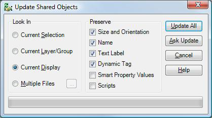 Company logo. You use your company's logo in many displays but recently the company changed its name and its logo. In one operation, all instances of the company logo can be modified or increased in size using the Update Shared Objects feature. In this case you would need to remember to uncheck Preserve Size and Orientation on the Update Shared Objects dialog box so that the logos don't resize and they don't move.