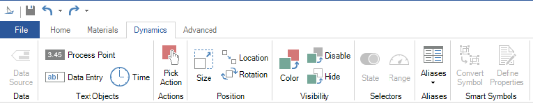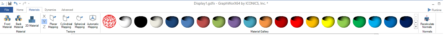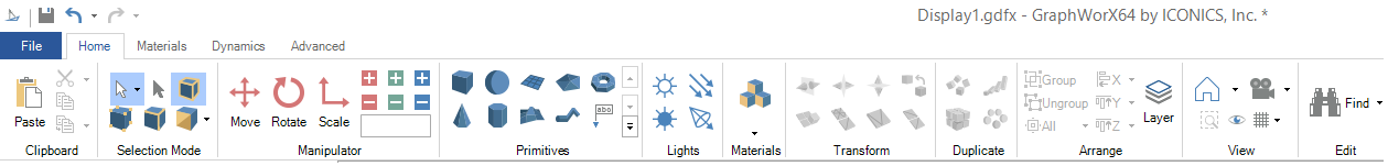 The 3D environment has its own File menu, and a ribbon with the following tabs: Home, Materials, Dynamics, and Advanced. Double-clicking on a ribbon tab opens and closes the ribbon bar.