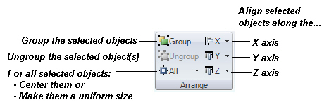 Arranging objects can be a challenging task until you become familiar with the 3D space in which they are located. GraphWorX64 offers a series of tools that facilitate this operation. These tools are conveniently located in the 3D Home ribbon in the Arrange section, shown here.