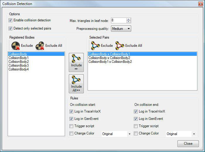 Listed in the Selected Pairs box are pairs of objects for which collisions will be detected, but only if there is a checkmark