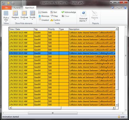 Below is a sample of GenEvents created by a collision detection test in a GraphWorX64 display. The events are captured in an AlarmWorX64 display; they show collisions between objects in a GraphWorX64 display that has a 3D viewport. For more about collision detection, refer to Collision Detection Section of the 3D Dynamics Ribbon.
