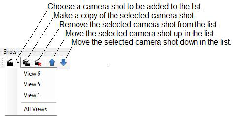 4. In the Shots box, use the icons to add the views to be included in the camera patrol. You can add selected shots, or add them all. You can also reuse a shot in the sequence by duplicating it and then moving the shot to an appropriate spot in the sequence.