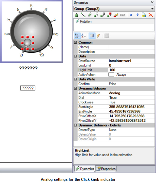 To configure a series of discrete switches: Remove the Rotation dynamic from the knob, then create different versions of the knob, one version for each position (0, 15, 40, 50, 75, and 100) on the dial. Center all of the versions over each other. Then define a Toggle action for each one; this turns each version of the knob into a switch. The Toggle action you define should display the next version of the knob, in sequence, with each click of the knob at runtime. Unfortunately, this method uses several copies of the same symbol and as such increases the displays memory consumption.