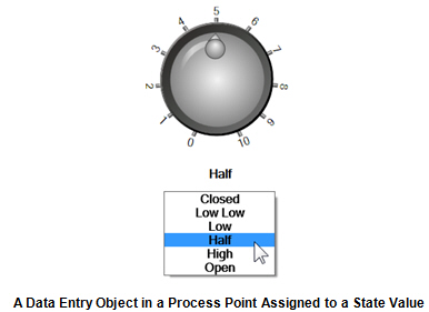 To see the similarity between the Data Entry label and the Process Point, try changing the Process Point dynamic’s DataEntry property to True. This simple change lets runtime users set the value using the Process Point; the StateText text strings display instead of the StateField and States values.