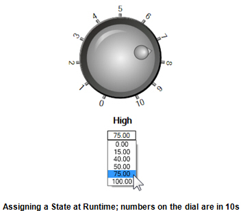 Click the Runtime button (at the top-right of the GraphWorX64 workbench) to go into runtime to see the annotation with its Data Entry label and Process Point. The text displayed above the list is the Process Point. (Numbers on the dial are in 10s; that is, 1 on the dial represents the value 10.)