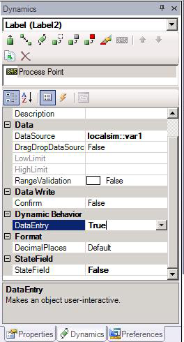 Set each of these objects' DataSource properties to localsim::var1; which is a declared variable. Because the Data Entry label is editable, its DataEntry property is set to True. Because the Process Point is not editable, its DataEntry property is set to False. Leave both objects’ DataEntry properties unchanged. (Note that, in the Dynamics tab, both a Data Entry label and a Process Point are called a "Process Point".)
