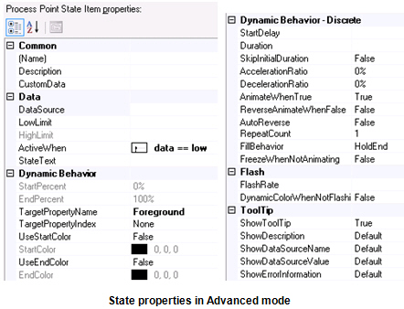 Note: If you are working in Advanced mode, additional state properties display. In Advanced mode, instead of entering the state value into the StateValue field, enter it into the LowLimit property. In Advanced mode, you can enter an acceptable range for the state by entering values for the LowLimit and HighLimit properties. |