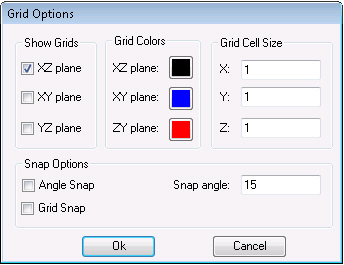 Show Grid menu item ( hot key = GRH) – Displays if a check mark is next to the option and hides a grid, if there is not a check mark next to the option, for each of the three axes. Displaying a grid can help you to figure out where you want to place objects in space.