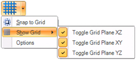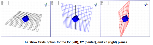 Show Grids displays the grid planes for the XY, XZ, and YZ axes. Which is the same as selecting the Show Grid menu option from the Grid button menu options. The grid planes are color coded so you can display them all at the same time. Displaying grid planes helps you to orient yourself in the 3D viewport so that you can rotate an object and look at it from alternate perspectives while understanding the orientation in the 3D space.