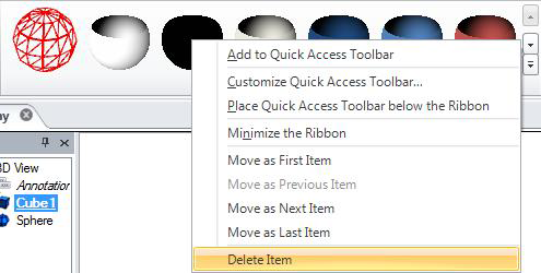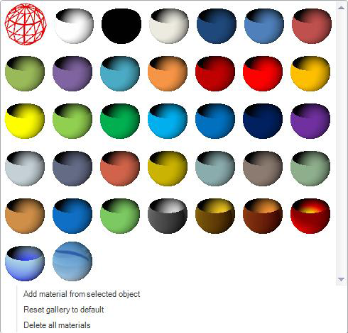 The Material Gallery is a place for you to store your most frequently used images and textures. Each material that you add to the gallery appears in the Material Gallery section of the Materials ribbon. The Material Gallery is a repository of 3D materials and textures you can apply to the surface of a design. For example, you can apply the image of brickwork to the objects that create the walls of a room, or the image of cardboard to cube-shaped objects that are boxes. Use the buttons in the Texture section to map the surface of the object so that an image can be drawn on it. The surface can be a plane, a cylinder or tube, a sphere, or automatic. A drop-down menu in the Material Gallery gives you options to add and remove materials from the gallery.