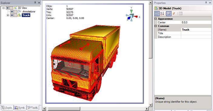 In GraphWorX64, open the display that has the 3D objects whose polygon count you want to reduce. Go into the 3D viewport and in the object Explorer, select the object you want to reduce. It will look something like the following. Note the legend in the 3D viewport and the object's Properties displayed at the right.