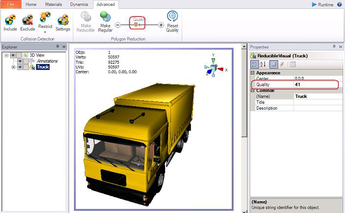 You can stop here if you like. Taking no additional steps gives you the ability to undo your polygon reduction at any time by clicking the Reset Quality button on the ribbon's Advanced tab. Stopping here improves rendering performance at runtime but because the model's detail are all still stored with the display you will not improve the display's loading performance.