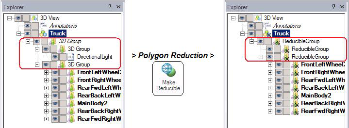 Let's look at what happens in the object Explorer when you click the Make Reducible button. In this example, the truck's 3D groups become reducible groups, and their icons also change. After reducing the polygons, if you then click the Make Regular button to make the changes permanent, the reducible groups revert back to their 3D groups, minus any features that were lost in the reduction. Note how in the example below the "DirectionalLight" object was lost in the reduction.