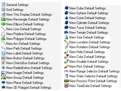 In GraphWorX64, you can set preferences (or default values) for the primitives and dynamics that you create. The Preference tab lists the objects you can set default values for, and includes general settings, grid settings, 2D shapes, groupings, 3D primitives, and dynamics. For a list of the preferences available to you, refer to Preferences.