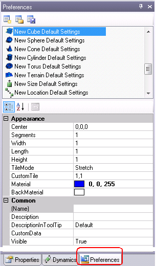 Click the object whose default values you want to change. For example, if you want to apply a wood texture to all new cubes that you create, click New Cube Default Settings. The preferred settings appear at the bottom of the tab.