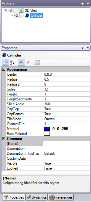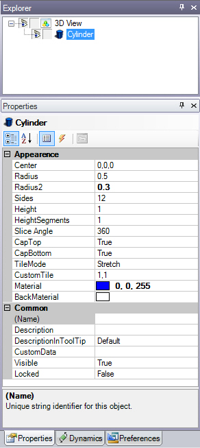 1. Add a Cylinder primitive to your 3D view by clicking the cylinder icon in the Primitives section of the Home ribbon. The Cylinder will appear in your 3D view, and you will see it listed in the Explorer and the Properties tab.