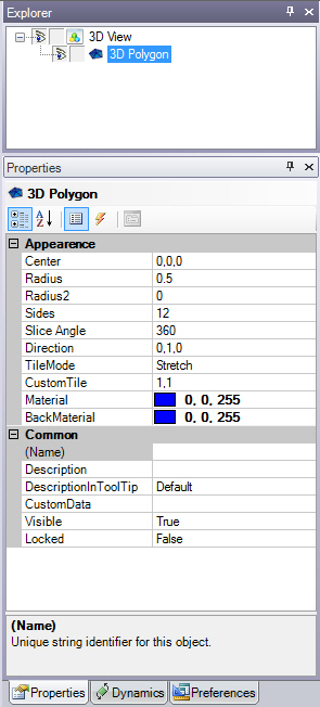Add a polygon primitive to your 3D view by clicking the polygon icon in the Primitives section of the Home ribbon. The polygon will appear in your 3D view, and you will see it listed in the Explorer and the Properties tab.