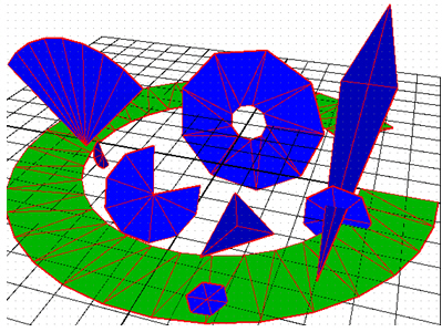 A polygon is a straight-sided shape of three or more edges; it is a two-faced shape that has a front and a back. You can set different colors for each side. It is defined by three-dimensional points (vertices) and the straight lines that connect them (edges). The interior region of the polygon’s surface is called the face. Add it to your 3D view by clicking the polygon icon in the Primitives section. A polygon primitive can take on any number of shapes. Like the plane, a polygon is a two-faced primitive that has a front and a back; you can set different colors for each side of the polygon. Default property values for polygons are set in the Preferences tab, in the New 3D Polygon Default Settings.