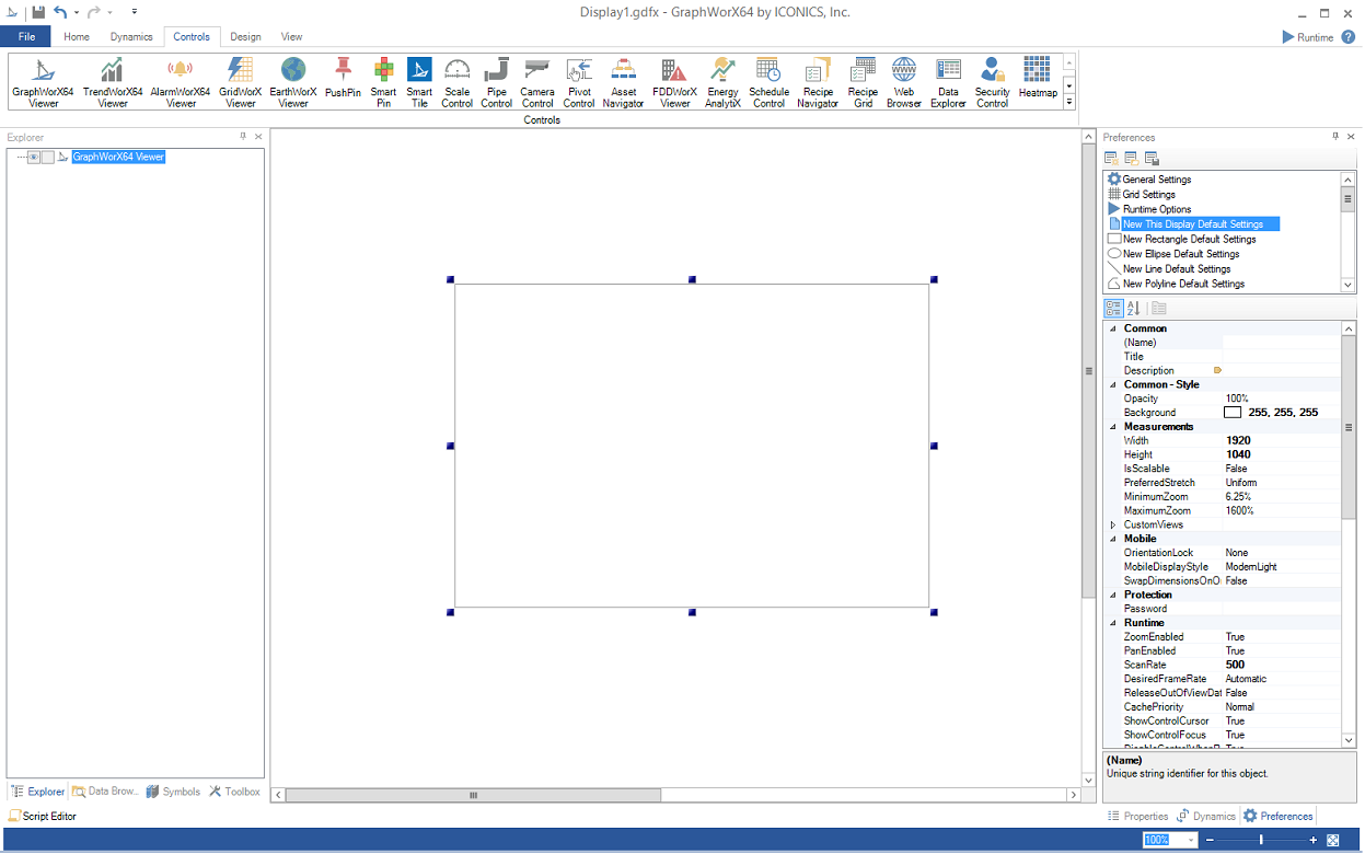 To add a GraphWorX64 Viewer within a GraphWorX64 display, click on the Controls ribbon, then on the GraphWorX64 Viewer icon and then click within the main window or draw a box where you intend the viewer to appear.