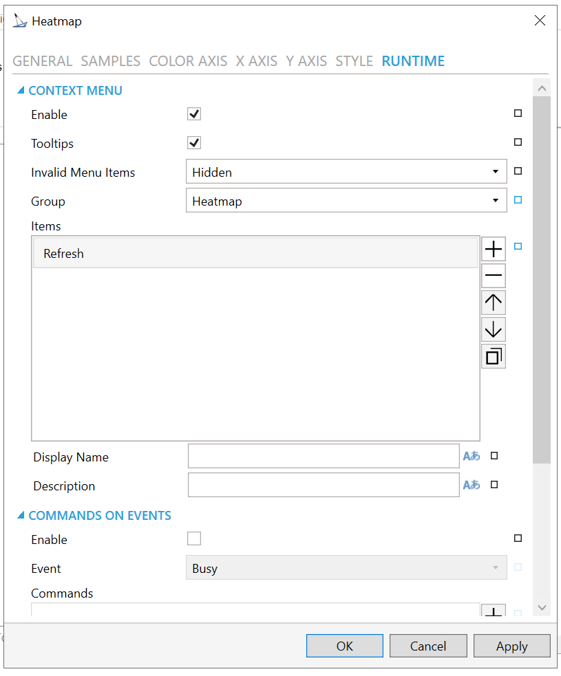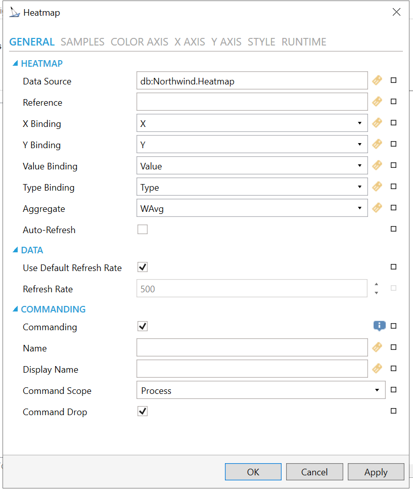 Commanding - Determines whether commands are enabled for this display. Use the CommandingName setting to specify a registration name. Click this checkbox if you intend to use Commanding with the current Heatmap control. You can also click on the
