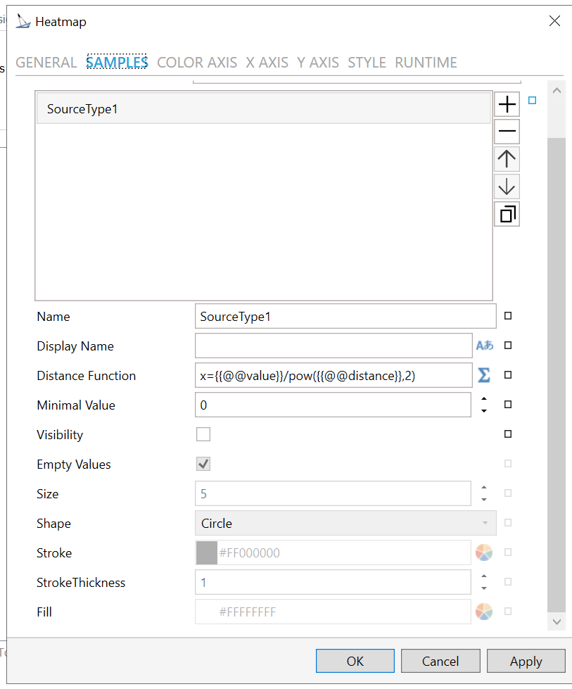 Data Source - Data source for the heat map. Can be any data set with at least three columns: X and Y position and value. Enter a data source for the Heatmap control in the text entry field or click on the