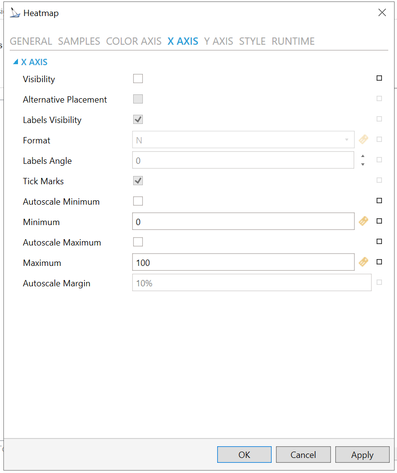 Visibility - X Axis visibility. Click the checkbox to make the X axis visible. You can also click on the