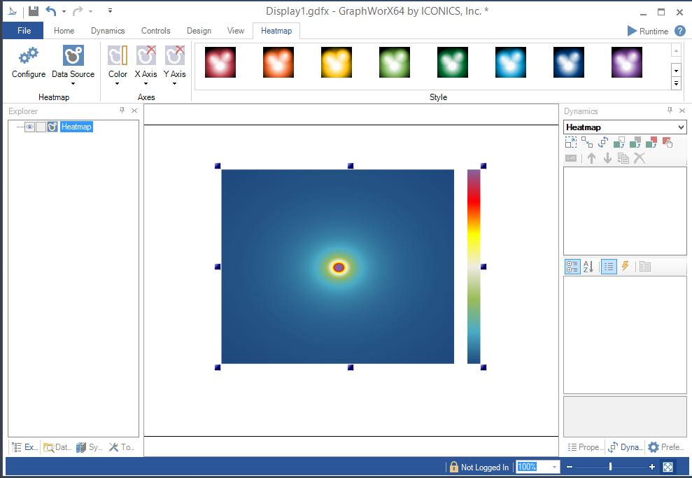 Open GraphWorX64, then click on the Controls ribbon and then on the Heatmap control. The cursor will turn into a crosshairs "+", which will allow you to draw the size of the Heatmap control you would like in the center display portion of the GraphWorX64 configuration window. Simultaneously, the GraphWorX64 ribbon will change to allow modification to the Heatmap settings.