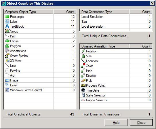 Although the object Explorer shows you all of the objects in your display and indicates their order, it doesn't provide a listing of the number of objects in each of the different object types or categories. If you want to see how many objects of any type, the number of data connections, or the number of dynamic animation types that a display has defined, you can use the Object Count function to provide this information.