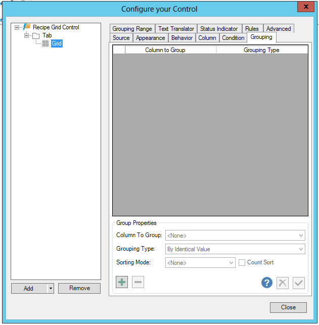 Use the Recipe Grid Control configurator's Grouping tab to select the criteria on which to group columns in your grid. You can also select the type of grouping to include (e.g. by identical value).