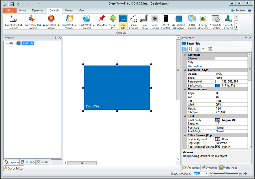 1. Open a new display in GraphWorX64, then select the Smart Tile control from the 'Controls' ribbon, as shown below.