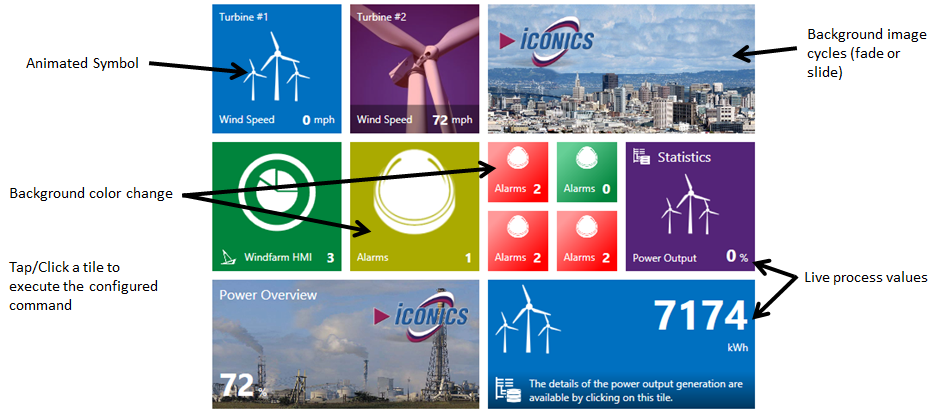 Smart Tiles are useful, at-a-glance graphic visualization tools that provide real-time information similar to Live Tile technology found in Microsoft Windows 8, Windows RT, and Windows Phone operating systems. The difference is that ICONICS Smart Tiles, created through the Smart Tile control in GraphWorX64, are applicable within HMI screens, whether those are PC-based or for mobile devices (phones, tablets, etc.).