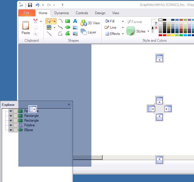 - Double-clicking on a ribbon tab (such as, Home, Dynamics, and so on) expands and collapses the ribbon. For more information, refer to the topics called 2D Ribbons in GraphWorX and 3D Viewport Ribbons.