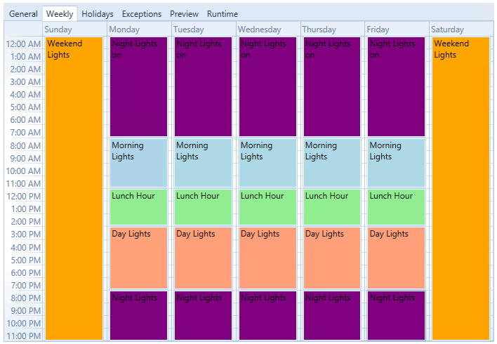 Weekly Tab in the Schedule Control (from a ScheduleWorX View configuration) in GraphWorX64 Display Runtime