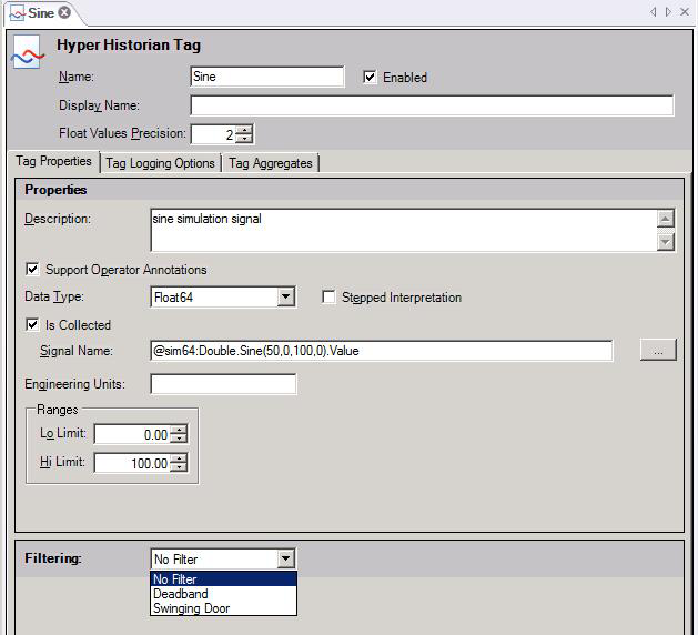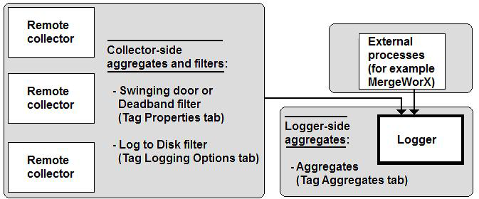 In addition to collecting data, you may be writing data directly to the logger using some other, non-Hyper Historian vehicle, such as a MergeWorX or a TrendWorX64 Viewer. You can still create Hyper Historian tags for this data and logger-side configure aggregates for it. Although you lose collector-side aggregation and filtering, this gives you a filtering mechanism for the data that is written directly to the logger.