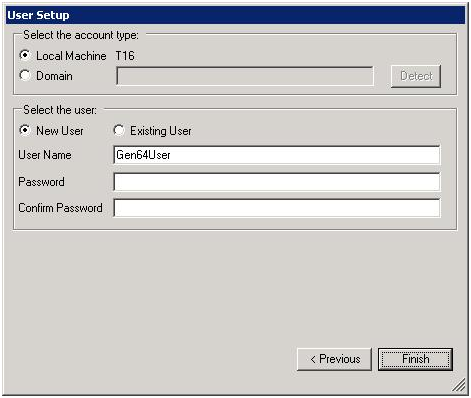 Either select the New User radio button and enter the User Name and Password for that account; or select the Existing User radio button and select the User Name of the account then provide the password for that account. Then click the Finish button.
